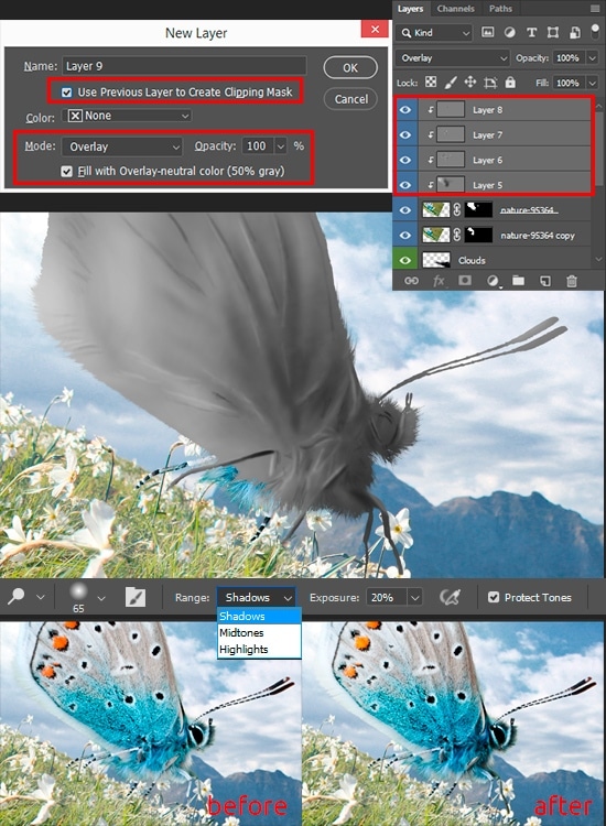 Now let’s work on the details and lighting. For this, I used the so-called “Dodge and Burn” technique. Create a new layer with “Overlay” Blending Mode as clipping mask to the butterfly layer (Cmd/Ctrl + Shift + N) to create light and shadow with Dodge/Burn Tools (O). Start adding light and shadows according to the light source, add more volume, emphasize the edges, and fix the lighting. But do not overdo it and do not forget that you can create several layers with corrections. Change the settings, depending on the situation. There is a lot of manual and accurate work, so do not rush and use Zoom Tool (Z) to better see details. Also the Opt/Alt key toggles between tools.