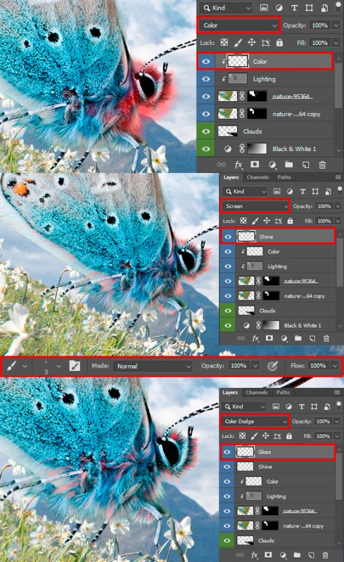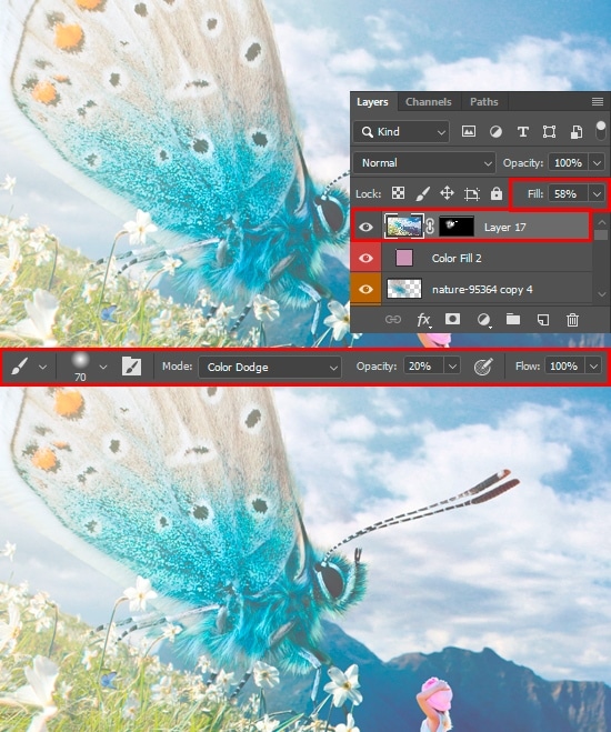 A little butterfly retouching does not hurt. Create a new layer with “Color” Blending Mode (Cmd/Ctrl + Shift + N), as clipping mask to the butterfly. Use a soft round brush with Size: 70px, Opacity: 20-50%, Color: #59919d to make light fur the same tint, like the butterfly. Add more extra layers with fur, as in Step 15. One with “Screen” Blending Mode to add lighted hairs, and one with “Color Dodge” to create sparkling hairs, gloss on fur. All this is necessary for the butterfly to more match the general lighting in our artwork.