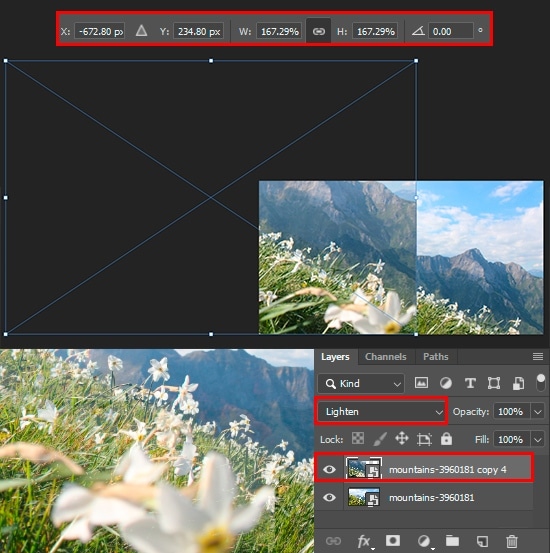 Duplicate layer (Layer > Duplicate Layer or Cmd/Ctrl + J) and change Blending Mode to “Lighten”. This hides all darken areas on the photo, so leave only the flowers of daffodils and bright grass. With Move Tool (V) position daffodils on the hill so the blurred flower showing up in the foreground. This blurred flower help to create a depth of field in the image, at the same time add more flowers.
