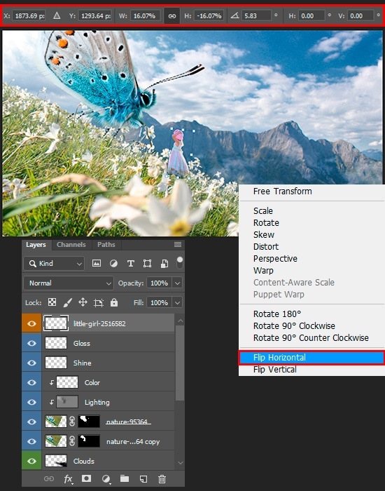Scale the girl (Cmd/Ctrl + T), making her even a little less than necessary, keeping in mind the proportions of the butterfly. Regarding the proportions in the image. Do not be afraid to embellish it a little. Considering that, arrange the elements relative to each other. The scale of the girl should not exceed the height of the butterfly. In this case, if it is a little less, it is good.