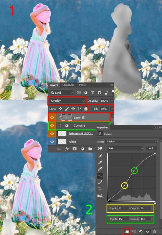 As in the case with the butterfly, we fit the lighting of the figure with the estimated lighting source. I used the technique of Step 17. Repeat this on the girl, but do not overdo it. The effect is less, so it is more realistic. Lighten the image to match the overall atmosphere. I used the “Curves” adjustment layer (Layer > New Adjustment Layer > Curves) and create an “S” shaped curve, as shown in the image below. Place that layer between “Overlay” and original layers. Feels free to reduce effects if you feel that this is too much influence the image.