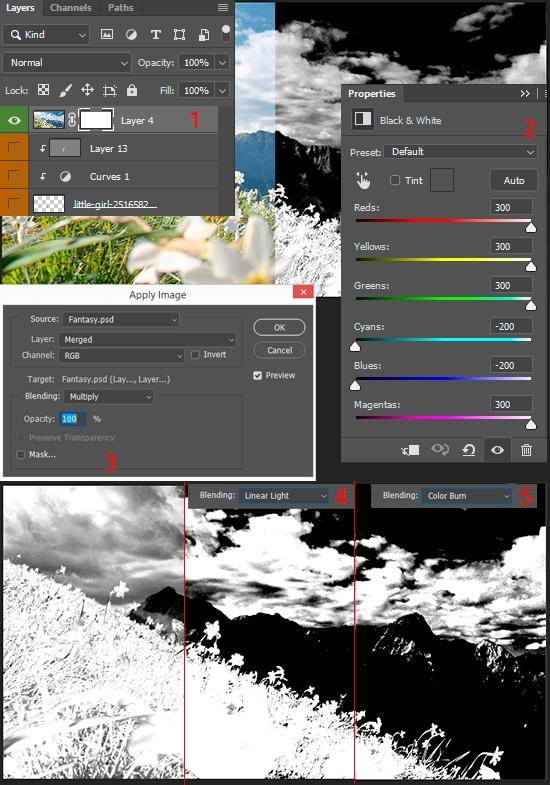 Now we make the characters stand among the grass. We do not use common methods because they require a lot of time and effort. Hide all introduced objects from Steps 11-21 by clicking on eye icon near the layers. Create a merged copy of that state of artwork (Cmd/Ctrl + Opt/Alt + Shift + E), without any additional objects at the top of all layers. Add “Black & White” adjustment layer (Layer > New Adjustment Layer > Black & White) with the settings from the image below. Further, as in Step 12, add a layer mask to the merged layer and apply black and white state on it (Image > Apply Image). Apply the image on the mask again with “Linear Light” and then “Color Burn” Blending option.