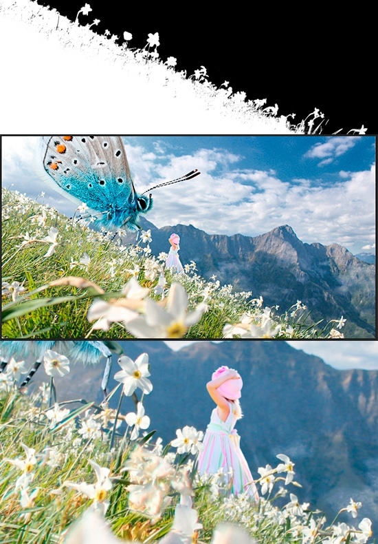 Make the same thing again, repeat Steps 2 and 3. Duplicates Landscape layer (Cmd/Ctrl + J) and bring it to the top of the Layers panel. Go to Edit > Transform > Free Transform (Cmd/Ctrl + T) to scale layer and make smaller flower nearby. Add a black layer mask (Layer > Layer Mask > Hide All) and with the Brush Tool (B) restore flowers on the hill. Remove overlapping flowers where it not realistic.