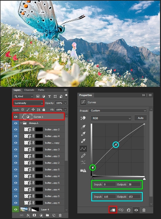 Move the finished images into a working document. Reduce the scale of the butterflies and rotate them to get the most varied figures. Use Move Tool (V) with the Opt/Alt key to quickly duplicate the layer. Try to place large butterflies, and then make up the harmony with the help of small ones. Start from the foreground and move to the hill or horizon. Do not make large flocks. When done with butterflies, group all these layers (Cmd/Ctrl + G or Layer > Group Layers) or merge these layers (Cmd/Ctrl + E). Apply the “Curves” adjustment layer (Layer > New Adjustment Layer > Curves) as a clipping mask to the group. Lighten the shadows to create a blurred look.