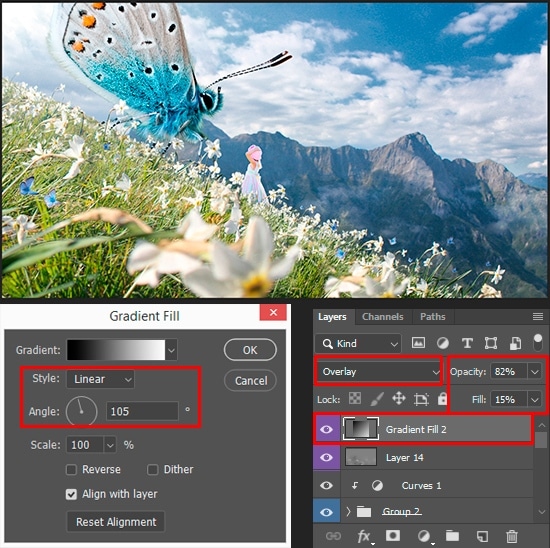 To darken the foreground and right side of artwork, I use “Gradient Fill” layer (Layer > New Fill Layer > Gradient) with settings: black and white preset, Style: Linear, Angle: 105 degrees. Use “Overlay” Blending Mode and Opacity: 82%, Fill: 15% to reduce the effect.