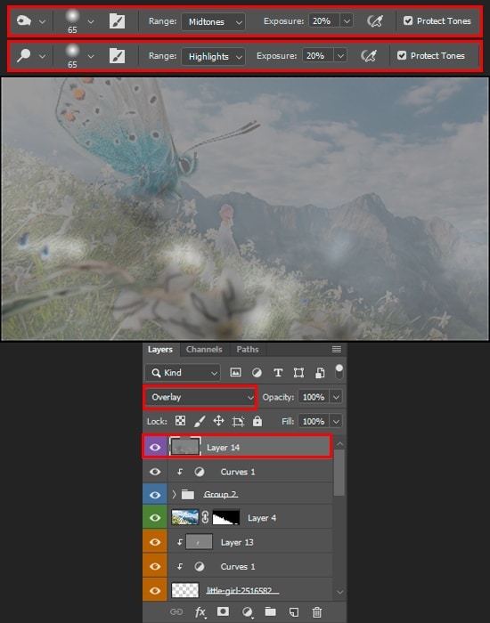 Now that we have nothing else to add and the composition is ready. It is necessary to bring the lighting of our picture to a single source so that the details do not seem disconnected. Using Step 17, create a new “Overlay” layer at the top of the Layers panel (Cmd/Ctrl + Shift + N). Adjust the lighting a bit, with Dodge and Burn Tools (O). Add shadows under the butterfly and from the girl. Some details on small butterflies.