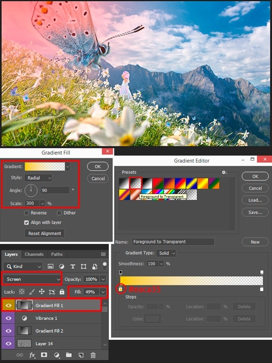 To create a more joyful and sunny atmosphere, I use two “Gradient Fill” layers (Layer > New Fill Layer > Gradient). First of it with the settings: Style: Radial, Scale: 300%, gradient preset “Foreground to Transparent”. A change gradient left color stop to #eaca35. Move the gradient while “Gradient Fill” window is active, so drag the center of the spot in the top left corner. Set Blending Mode to “Screen”, reduce Fill to 49%.