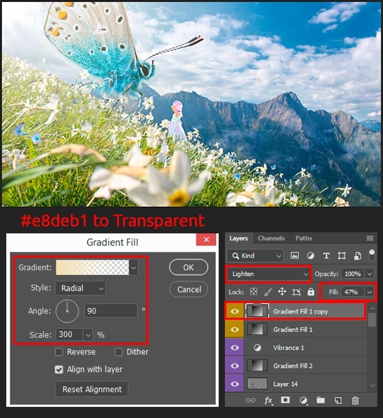 Next “Gradient Fill” layer is very like to the previous one with the exception that changed color to #e8deb1. If the effect seems strong, move the gradient slightly to the left. Change Blending Mode to “Lighten”, Fill: 47%.