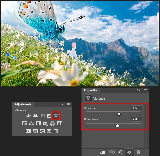 Our artwork is very nice. But after the adjustment layers a bit gray. Let’s make colors more expressive and vibrant. I will also show up a sunny atmosphere. Add “Vibrance” adjustment layer (Layer >New Adjustment Layer > Vibrance) and set Vibrance: +22, Saturation: +15.