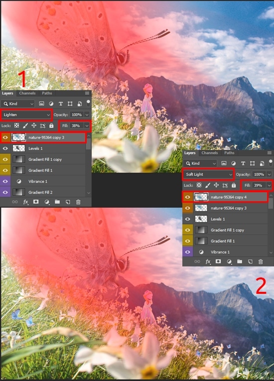 For the second copy, use “Lighten” Blending Mode and reduce layer Fill to around 36%. This layer will help to make the rays more tangible, and the light more like volumetric. Move this layer to the upper left corner and slightly stretch it horizontally (Cmd/Ctrl + T) so that the rays touch the hill. Move the third copy there, scale it so that the rays cover even the girl. Change Blending Mode to “Soft Light” and reduce layer Fill to around 39%.