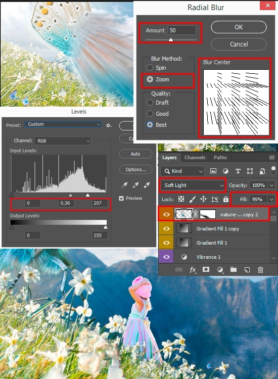 I wanted to create sun rays effect from the butterfly, just like when the sun breaks through the leaves. Here I want to create the same effect because the butterfly covers the source of light. Create a copy of the butterfly by highlighting all layers with it and using Cmd/Ctrl + Opt/Alt + E to create merged copy only that layers. Move that layer at the top of Layers panel and go to Filter > Blur > Radial Blur. Use settings like Radius: 50 pixels, Quality: Best and move reference point directly to the top left corner. To prevent the rays from having such hard edges, apply a “Gaussian Blur” (Filter > Blur > Gaussian Blur) with a Radius: 15 pixels. We will need two more copies of this layer, so duplicate it two times (Cmd/Ctrl + J). Change Blending Mode of the first layer to “Soft Light”, reduce Fill to 95%. A move rays to around half of the wing with Move Tool (V). To reveal the texture of the rays, apply the same trick as for the clouds, apply the adjustment “Levels” (Image > Adjustments > Levels or Cmd/Ctrl + L) with the settings as shown in the image below.