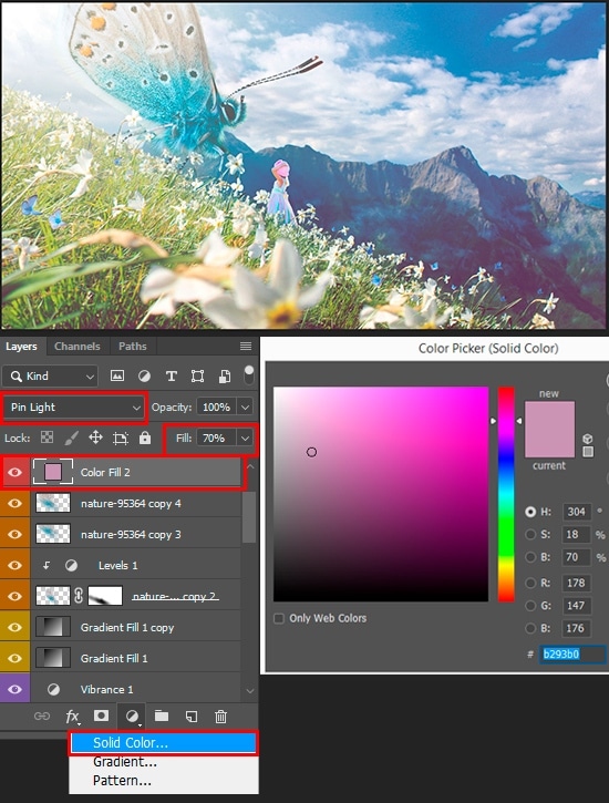 To combine all the elements of lighting and add an unusual shade to the image. “Solid Color” layer (Layer > New Fill Layer > Solid Color) and set a color to #b293b0. Use “Pin Light” Blending Mode.