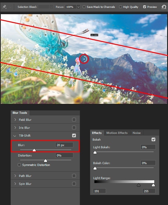 A blur helps to hide many flaws when used correctly. We use Tilt-Shift Blur from Blur Gallery. Again, create a merged copy of artwork (Cmd/Ctrl + Opt/Alt + Shift + E), go to Filter > Blur Gallery > Tilt-Shift. This feature is available in Photoshop CS6 and above. In the workspace that appears, set Blur to around 20-25 pixels, Angle in the range from -12 to -15 degrees. Add a layer mask and remove blur from antennae of the big butterfly.