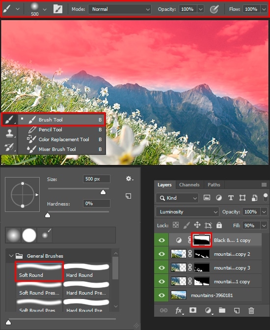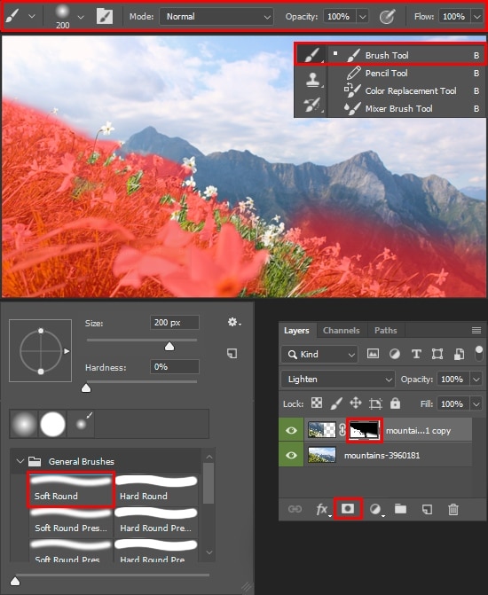 In some places, grass appears through the flowers. This is due to the influence of the blending mode. If for small flowers it’s okay, then large flowers in the foreground need to fix. Duplicate this layer (Cmd/Ctrl + J), restore Blending Mode back to “Normal”. Fill a layer mask with black color via Edit > Fill > Contents > Black or use shortcut Shift + F5. Take the Brush Tool (B) with Soft Round preset and white color. Restore the flowers in the foreground, but so that the original background does not appear. Just stay away from the edges of the flowers.