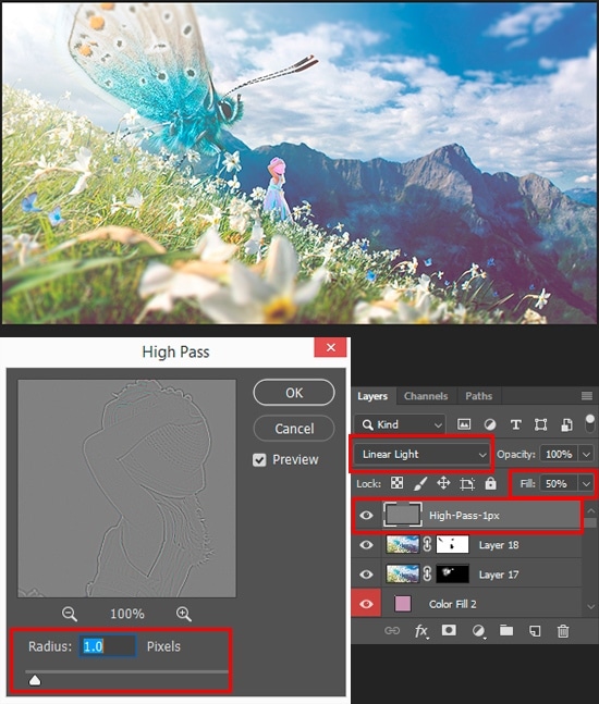 Now sharpen a bit the final result, if you want. Create a merged copy of image (Cmd/Ctrl + Opt/Alt + Shift + E), and apply “High Pass” filter (Filter > Other > High Pass) with Radius: 1 pixel. Reduce Fill to 50% and change Blending Mode to “Linear Light”.