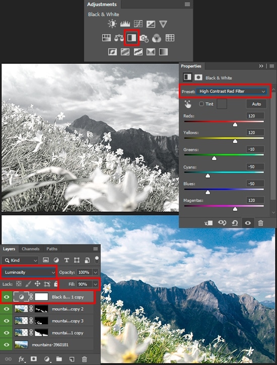 The sky is overexposed and the shadows from the clouds have partially disappeared. This time we are not using standard solutions like Curves, Levels or Camera Raw, even though it is possible to deal with it better. Instead of this, use the “Black & White” adjustment layer (Layer > New Adjustment Layer > Black & White) with preset “High Contrast Red Filter”. These settings have greatly changed our image, the sky has become darker, the details are more saturated, and the tonal values has partially returned to the clouds. It remains only to change the Blending Modeto “Luminosity” and reduce Opacity to 90% to manipulate lightness values in the image and ignore the color information completely.
