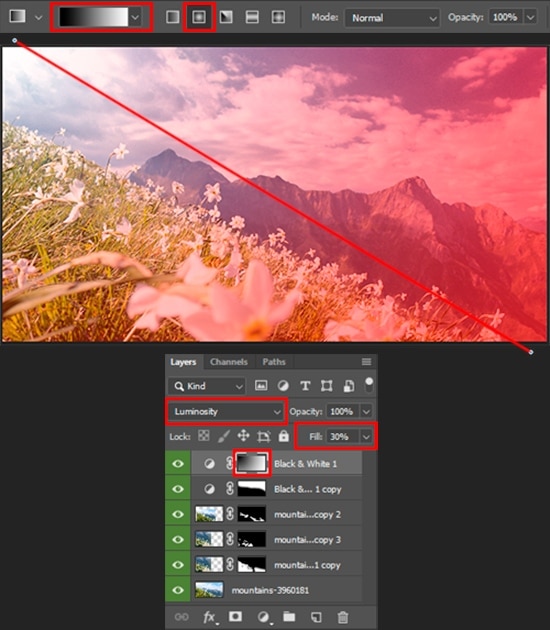 Duplicate this layer (Cmd/Ctrl + J) and restore the mask to white (Edit > Fill or shortcut Shift + F5 either Cmd/Ctrl + Del). Take a Gradient Tool (G) with a black and white, radial gradientpreset. Start to draw a gradient from top left to bottom right corners. Reduce layer Opacity to 30%. This layer will help emphasize the light source, darken the edges of the image so that all parts are in the same key. Also, soften the effect on mountains and hill.