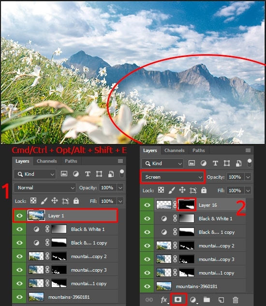 If necessary, you can apply “Levels” adjustment (Cmd/Ctrl + L) to make the mask a more contrast. You need to darken the background to the maximum so that you can get a clear outline of grass and daffodils. Use a brush with a hard edge and remove the remnants of the sky, like in Step 13. Remove the halftones that create opacity and shadows on the flower petals. You need hard and clear silhouette, otherwise, the background will be visible in these places. Mask edges can be enhanced with filters, like in Step 14. Use the Zoom Tool (Z) and take a close look so that there are no black areas on the flowers, a dark glow around the grass. If this happens, use Brush Tool (B) of the appropriate size and settings to correct it carefully.
