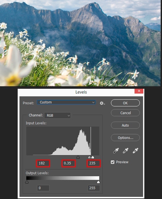 And yet, flowers of daffodils and mountains suffered from such a strong impact of the adjustment layer. For the sky, this is right, but for the foreground, you need to remove this effect. Highlight a layer mask, invert it (Cmd/Ctrl + I or Image > Adjustments > Invert). By using the Brush Tool (B) with Soft Round preset and white color, restore effect on the sky area.