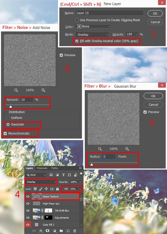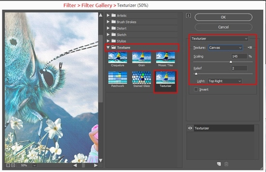Add a little texture to the image will be a good addition. This will certainly add vintage and artificiality to the image, but it will help to integrate all the introduced elements. You can go option and add a universal noise texture, canvas texture or use a third-party image. In the image below are some examples.