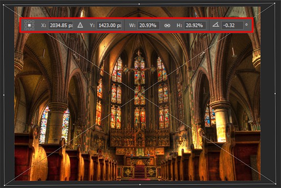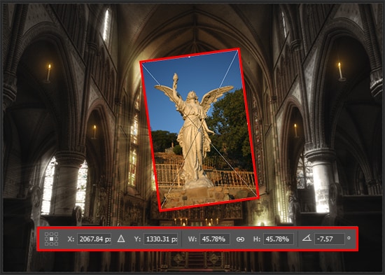 Before you start, I strongly recommend to you download all the resources in a convenient place and in the best quality! Go to File > New… or use Cmd/Ctrl + N to create a new document and use the following settings: Width: 4000px, Height: 2828px, resolution 300ppi, Background Contents: Black. Our background is only one image, so use File > Place/ Place Embedded… or just drag and drop “church-498525” image into working document. In Free Transform mode (Cmd/Ctrl + T or Edit > Free Transform) scale image proportionally to around 20.92% for horizontal and vertical scale, Rotate on -0.32 degrees and apply changes.