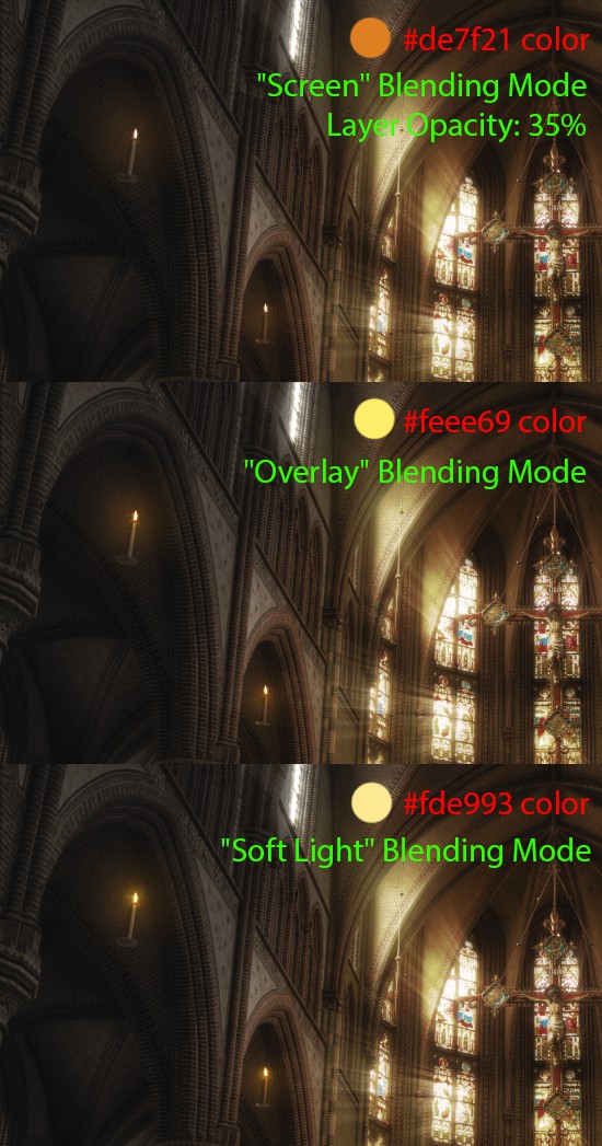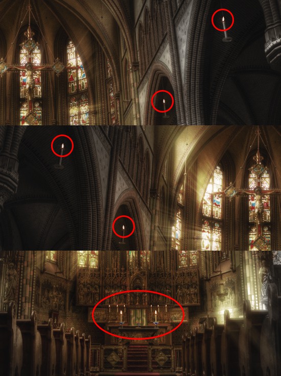 On this, the image toning is over and now I will add some fire to the candles. This will help reveal the story in the picture. I decided not to be lazy and photographed a candle. You can follow my example or use my image or any other. In any case, I place “003” image from my resource set into working document and resized to the appropriate scale. Use several copies (Cmd/Ctrl + J) of different sizes, and place them on lamps on the foreground and on the altar. The flame must be in proportion to candles, remoteness of objects, as shown in the image below. Use “Screen” Blending Mode to hide blacks and blend a flame.