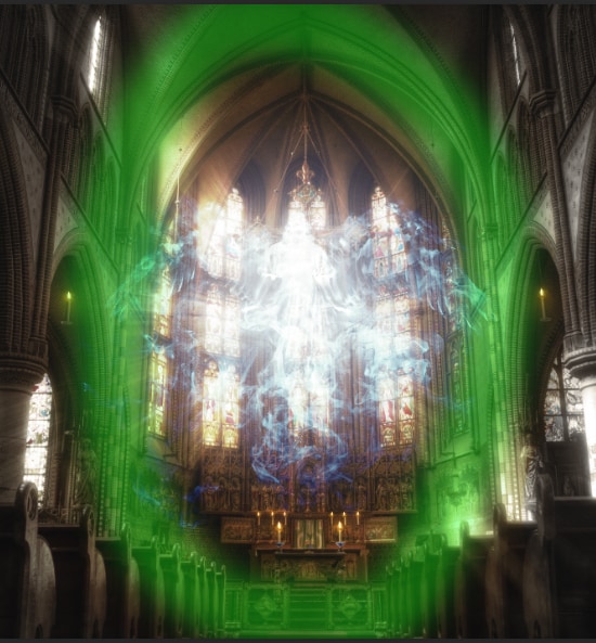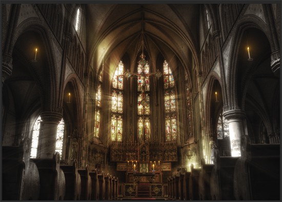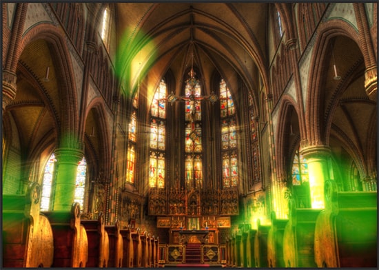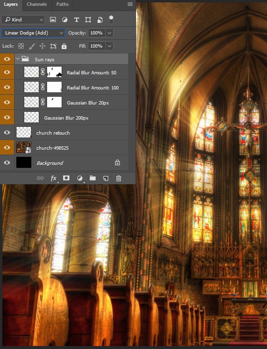 Use Eraser Tool (E) or add layer masks (Layer > Layer Mask > Reveal All) to layers with rays and with a big soft brush, with Opacity around 20-50%, remove where the texture looks badly or too bright. For example, on the lowest layer, blurring on the benches gives an incomprehensible glow. Also, I partially remove an effect from the other layers near the column on the right side of the image and slightly in the depth of the temple, because these elements have become too bright and spoil the image. Also, you should pay attention to the edges in the foreground from the blurred stained glass. It is necessary to make the transition more smoothly and naturally.