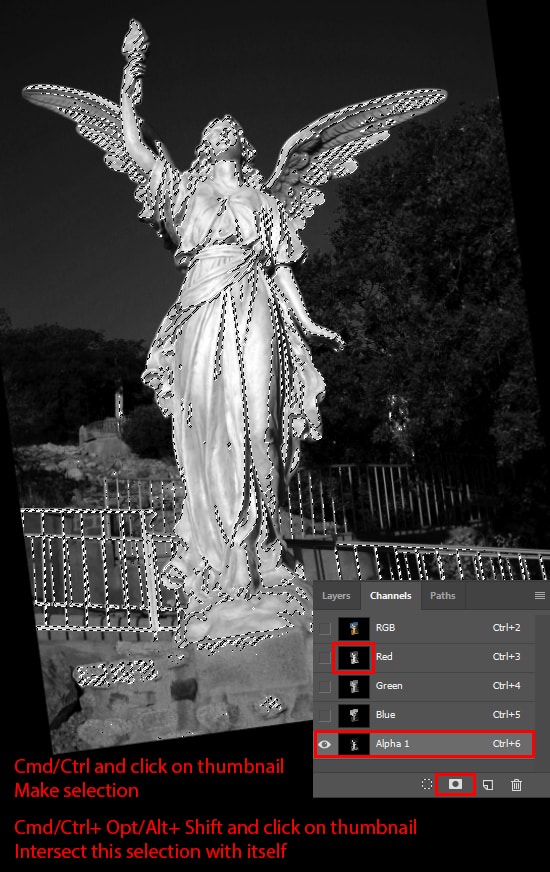 To separate the statue from the background, I used Chromatic key compositing technique. Open Channels panel (Window > Channels), hold Cmd/Ctrl+ Opt/Alt+ Shift and click two times on Red channel thumbnail (or another channel with good visibility of the desired object and contrast) to make the selection of intersecting with itself. In this exceptional case, it will help create a better contrast. Then, click on “Save selection as channel” icon to separate it on a new channel, which we will edit. Use Cmd/Ctrl + D to deselect and edit the entire image. In general, it is better to work with a duplicate of the original channel, but if the result is certainly good, then you can cut corners a little.