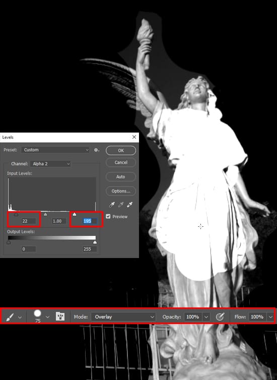 Take a Brush Tool (B) with hard round form, Size: 20-85px, set brush Blend mode to “Overlay” (Shift+ Opt/Alt + O) or “Normal” (Shift+ Opt/Alt + N) (depending on the editing areas), Opacity: 50-100%. Set Default Foreground and Background colors (D). Carefully restore the statue with white color and remove the background with black color, until you get a clear silhouette without halftones. I also removed wings because I’ll replace them with more realistic ones a bit later. Also, some details like the sleeve of the dress will not fall into the selection and this will give the form a slightly abstract look, which is quite good in this case. Optional, you can apply “Levels” adjustment (Cmd/Ctrl + L or Image > Adjustments > Levels) with a slight shift for whites and blacks (values depending on your result), to increase the contrast between the statue and the environment and remove debris and noise, if any.