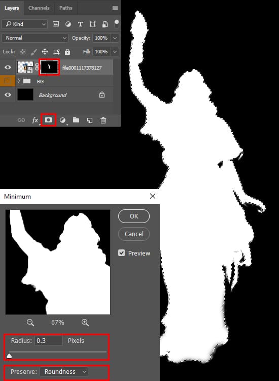 Hold Cmd/Ctrl and click on channel thumbnail, which you edited to create a selection and go back to Layers panel. Click on “Add a layer mask” icon (Layer > Layer Mask > Reveal Selection) to hide the background. I also apply a “Minimum” filter (Filter > Other > Minimum) with Radius: 0.3px and Preserve: Roundness to make the selection smoother, directly on the layer mask.