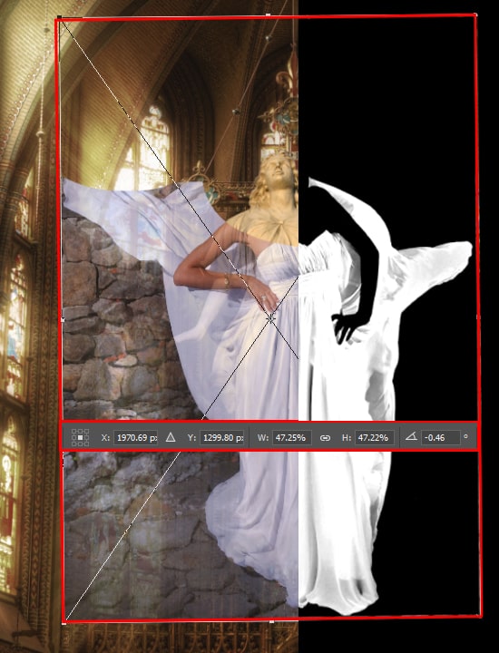 Next, I replaced the dress with a more realistic one. Place image “woman-1905520” and transform this layer, so that the skirt would fit and become a continuation of the statue, as shown in the image below. Repeat Steps 13-15 to separate the dress from the background, but leave the halftone in the fabric folds to get the transparency effect.