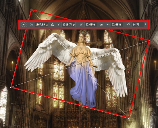 Place image “wings-474114” into working document. In Free Transform mode scale image proportionally to around 22.65% for horizontal and vertical scale, Rotate on 14.73 degrees. Duplicate this layer (Cmd/Ctrl + J) and flip it horizontally (Edit > Transform > Flip Horizontal). With Move Tool (V), arrange both wings relative to the statue, as shown in the image below. In order not to move the wing vertically, hold Shift key during the movement. Place both images under layers with a statue in a layer stack. Hide excess wing from each side, by using layer masks.