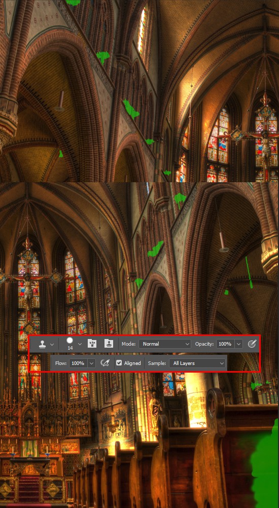 I did not like the lighting equipment in the church, so I remove it. Take Clone Stamp Tool (S) with Hard Round brush preset and set following settings: Size: 10 – 70px Opacity: 100%, Sample: All layers. You can use “Rotate the clone source” option from Clone Source panel (Window > Clone Source) to more accurately apply the correction. Be attentive and careful! Use appropriate sources to clone the texture, follow the architectural style and do not forget to create a new layer for each item or several brush strokes. When you’re done with it, select all created layers and merge it (Cmd/Ctrl + E or Right click > Merge Layers).