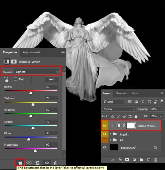 Now let’s start the effects! I recommend you to hide the group with the background and work on a black color, so you can more accurately see the details, effects and the color applied. Periodically open the background to see the composition as a whole and the quality of the effect. Add “Black & White” adjustment layer with preset “Lighter”, as Clipping Mask (Cmd/Ctrl + Opt/Alt + G or use icon at the bottom of opened window).