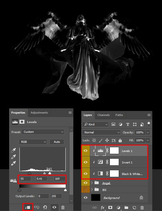 Next, add “Invert” adjustment layer and adjust the contrast with “Levels” adjustment layer with Blacks: 55, Midtones: 0.41, Whites: 169. All these layers are used as Clipping Masks, so carefully check your Layer panel to avoid misunderstandings. At this stage, you have several options. You can change settings and achieve good contrast with the help of “Levels” which we added or darken more than necessary (current settings) and restore the details in the right places. I chose the second way to control lighting and detail. So, create a new layer above “Black & White” adjustment layer. Use Brush Tool (B) with Opacity: 5-20%, Size: 10-150px and black color to restore or white to hide necessary elements and details.