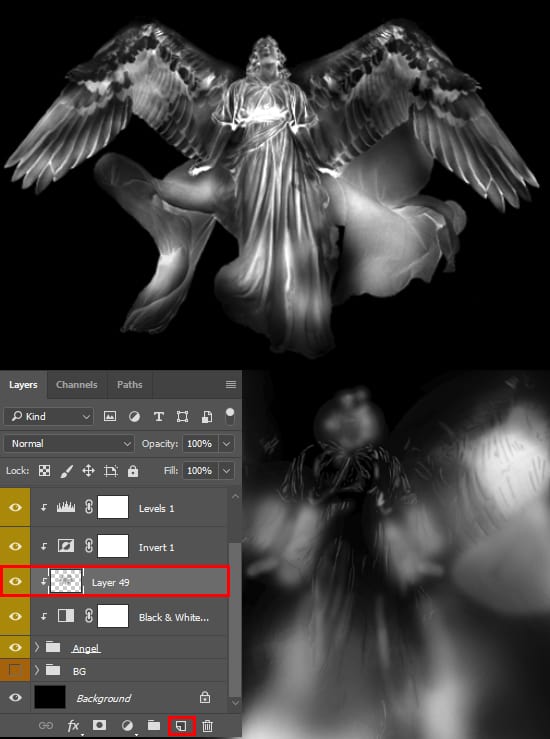 This completes the work with the angel, but since many different blending modes have been used, you cannot just open the background and enjoy the result. If you apply the adjustment layers with the color to the group with the angel, the result is not very good. Consequently, create a merged copy of the entire image via Cmd/Ctrl + Opt/Alt + Shift + E and change Blending Mode to “Screen”. Now hide all layers and groups with the angel, except gradient fill layer above background group. For this layer you need to reduce Opacity to 35%. Now you can enjoy the work that has been done, as soon as you open the group with the background. You can duplicate this layer and try other blending modes or adjustment layers and get a completely different result. Do not hesitate to edit the layers with the angel, especially from the Step 22, if the effect in some places will be invisible or in excess.
