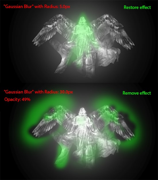 Select a group “Angel and mist” and use Cmd/Ctrl + Opt/Alt + E to create a copy of the content on a new layer. Duplicate this layer (Cmd/Ctrl + J) and change Blending Mode of both layers to “Color Dodge”. To the first layer apply “Gaussian Blur” with Radius: 5.0px, add inverted layer mask (hold Opt/Alt key and click on “Add layer mask” icon) and with soft white brush restore details on the face of an angel and a dress. Apply the same filter to the second layer, but with a larger radius, around 30px. Add a layer mask and remove the excess glow from the angel’s wings. Reduce layer Opacity to 50%. Move both layers to group with an angel on Layer panel.