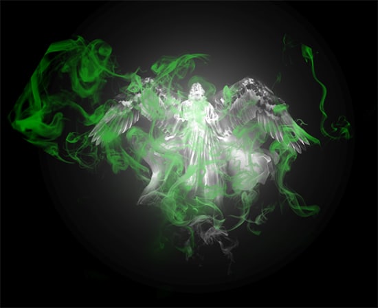 Create two more layers with “Screen” Blending Mode below “Angel” group. Use smoke brushes with settings for the brush, as in Step 25, but reduce the size. Add more details and create a transition from multiple streams of smoke to the angel’s image. Use the transformation tools (within reasonable limits) and many layers, which you can then easily merge (Cmd/Ctrl + E) into one. Feel free to experiment! Your creative decisions are very welcome! Also, do not forget that you can adjust the texture mapping using layer Opacity and layer masks or Eraser Tool (E).
