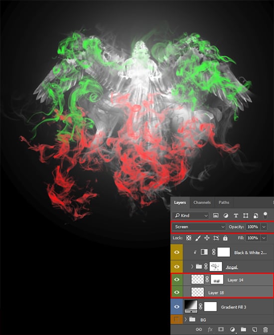 Hold Cmd/Ctrl and click on a layer thumbnail to create a selection. Add an inverted layer mask (Opt/Alt + click on “Add layer mask icon”) to a group “Angel”, with a soft round brush partially remove the effect from the fabric folds and face. Work with layer and mask of the group to achieve the transition effect from light smoke to dark. I got the result, shown in the picture below.