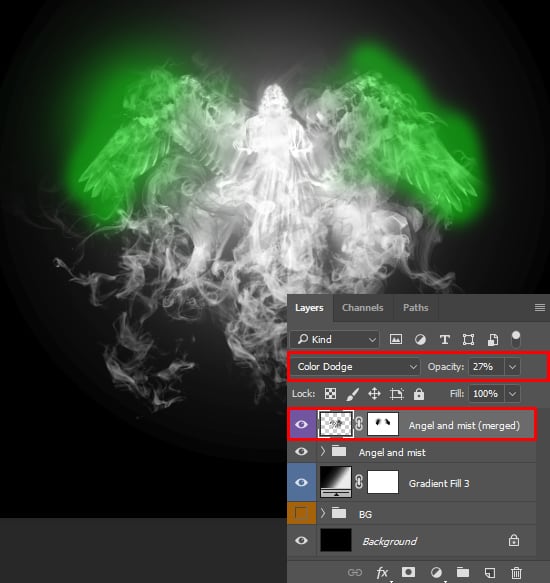 Again, create a copy of “Angel and mist” group on a new layer (Cmd/Ctrl + Opt/Alt + E), add a white layer mask and remove glow from wings with a soft round black brush (Opacity around 30%). Set Blending Mode to “Color Dodge”, Opacity to 27%.
