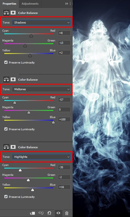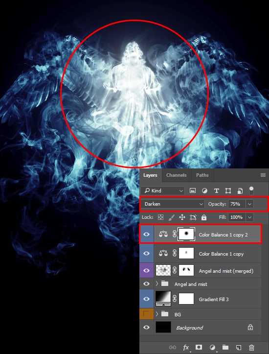 Now add a little color. I created a tint in bluish tones so that the angel contrasted with the lighting of the temple. Add “Color Balance” adjustment layer with the settings, as shown in the image below. Change Blending Mode to “Multiply” and on adjustment layer mask remove an effect from and angel body with soft round brush and brush Opacity to around 30%. Duplicate this layer and change Blending Mode to “Darken”, Opacity to 75%. And again remove the effect on the layer mask, but with a larger brush and with greater opacity value, to create a transition from the contrived blue tone to the gently green.