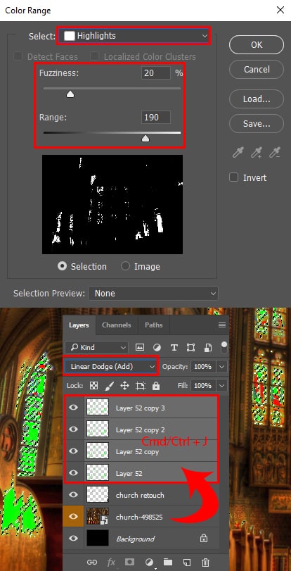 To create a more magical atmosphere, I created rays of light from the stained glass in the temple. For this, go to Select > Color Range… In the window that appears I choice Select mode “Highlights” and set Fuzziness: 20%, Range: 190. It is very important to find the right combination of values so as less as possible is unnecessary appear in the selection. Select a layer with the temple and use Cmd/Ctrl + J to separate content on a new layer. Duplicate this layer three times and change Blending Mode for all four layers to “Linear Dodge (Add)”. Group layers, by using Cmd/Ctrl + G or go to Layer > Group layers and set same Blending Mode.