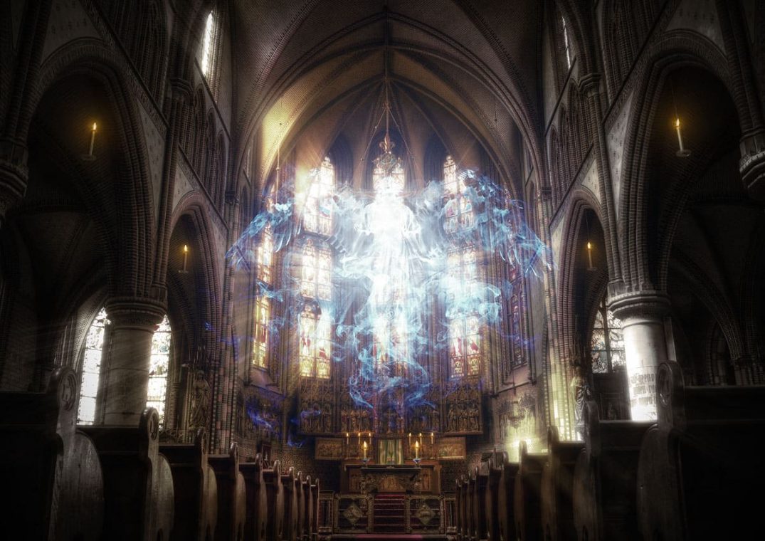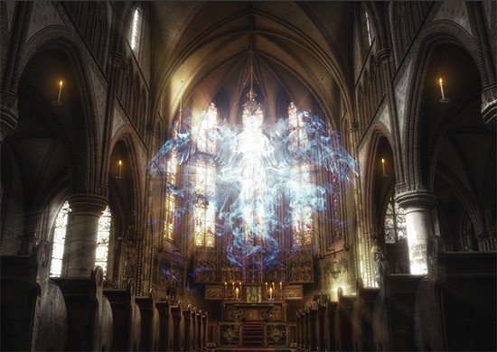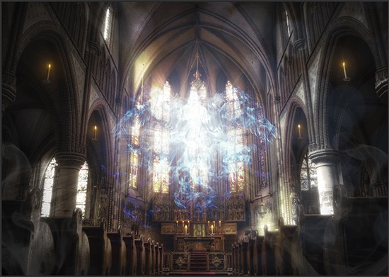Take a Brush Tool (B) with Size: 400px, Opacity: 40% Color: #3767bf and on a new layer with “Color Dodge” Blending Mode, draw a reflection of the shining angel on the temple walls. Just a small oval to emphasize realism. Reduce layer Opacity to 50%.