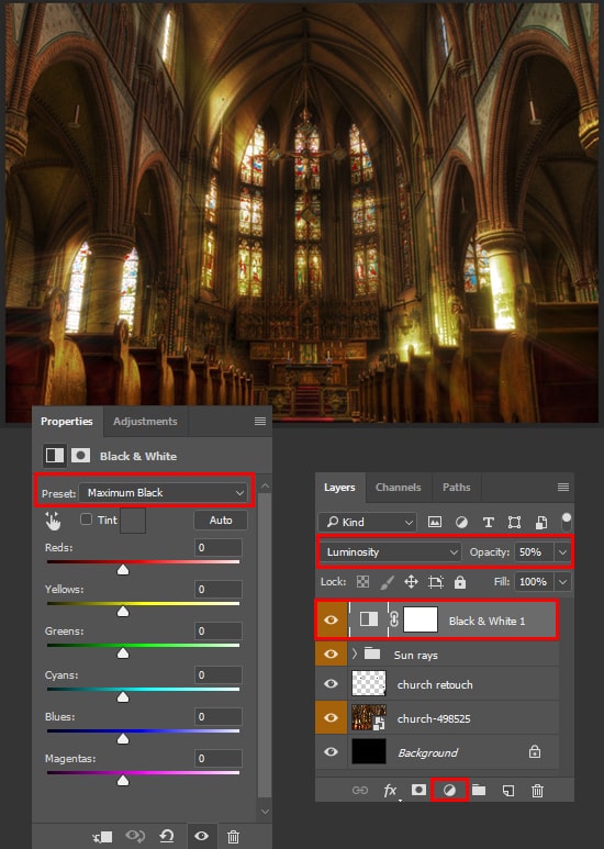 Now I’m starting to create a color atmosphere. The temple looks very bright and colorful, but I want to create an atmosphere of mystery, so I’ll make the tone more muted and less bright. So, I add some adjustment layers and first of them is “Black & White” (Layer > New Adjustment Layer > Black & White or use “Create new fill or adjustment layer” icon). Use preset “Maximum Black”, change Blending Mode to “Luminosity” and reduce Opacity to 50%. This will slightly change the chiaroscuro of the room and remove unnecessary saturation.