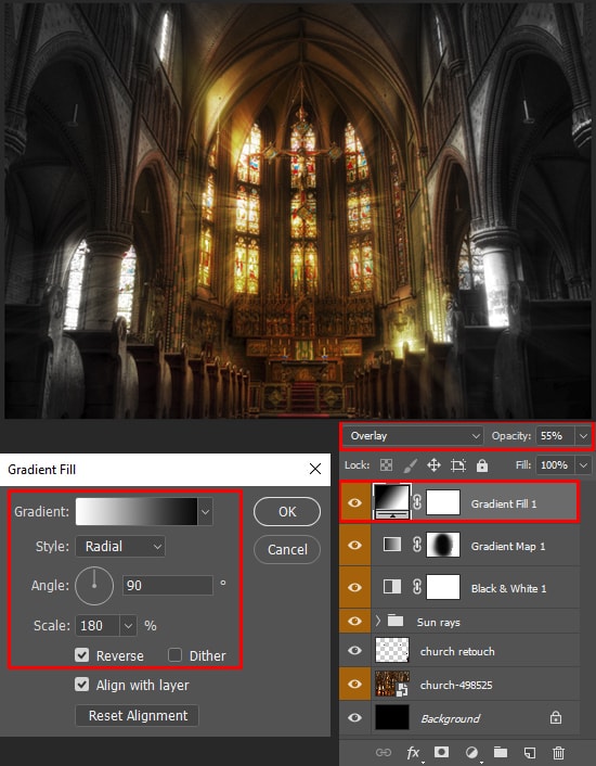 Go to Layer > New Fill Layer > Gradient, in the window that appears set Style: Radial, Angle: 90 degrees, Scale: 180%, Preset “Black, White” with a Reverse option. Change Blending Mode to “Overlay”, Opacity: 55%. The hall is very changed. I like the center of the image, where the solar atmosphere remains in combination with the dark hall. This will focus the viewer on the main thing.