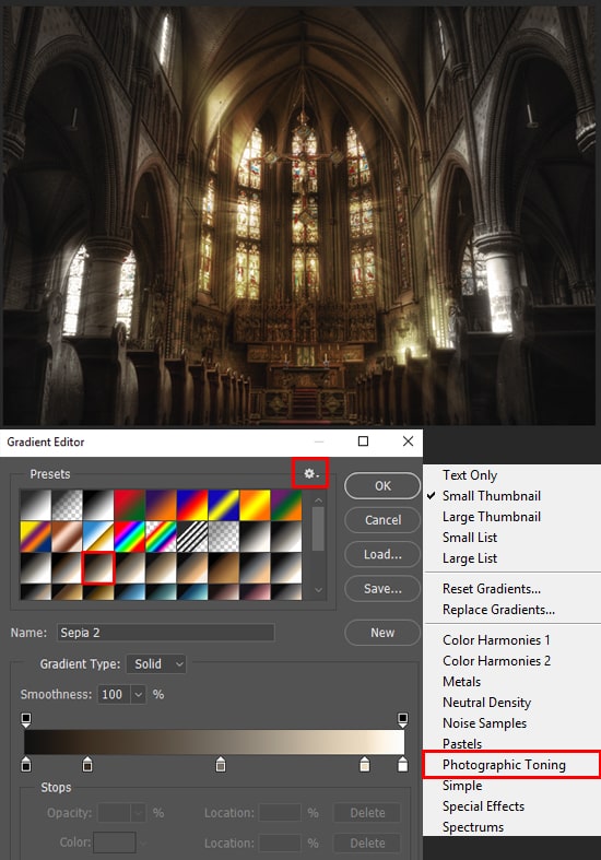 Add one more “Gradient Map” adjustment layer with “Sepia 2” preset from “Photographic Toning” gradient set. You can find it among others additional sets by clicking on an icon in the form of a gear. Now the shadows have ceased to be too contrasting and a nice haze appeared in the image. This is very complementary to the atmosphere, but it is necessary to restore effect of other colors, so reduce Opacity to 45%.