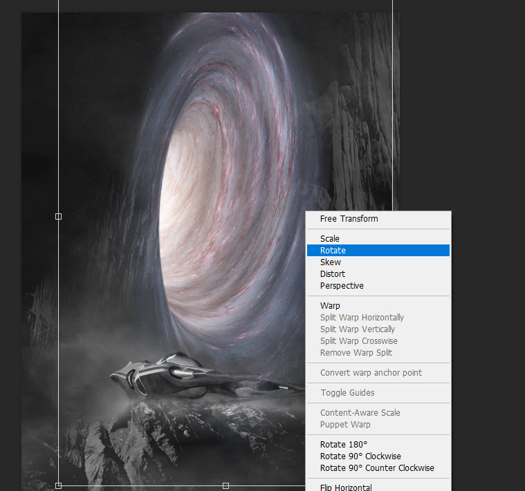 Load the worm hole image into Photoshop, place it on the centre of the canvas as shown below. Use the free transform tool to adjust its shape: