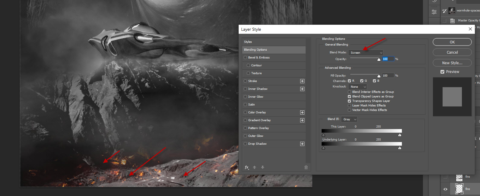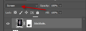 Make sure to set the layer blend mode for this worm hole layer to “screen”: