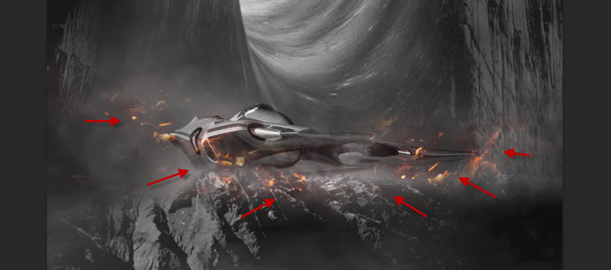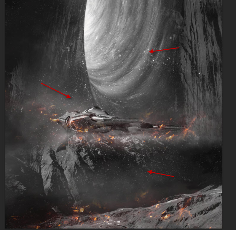 Copy and paste the selection to our document, place them around the mountain rock surface and the spaceship: