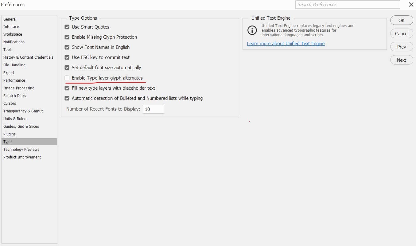 - Uncheck: “Enable Type Layer Glyph Alternates”